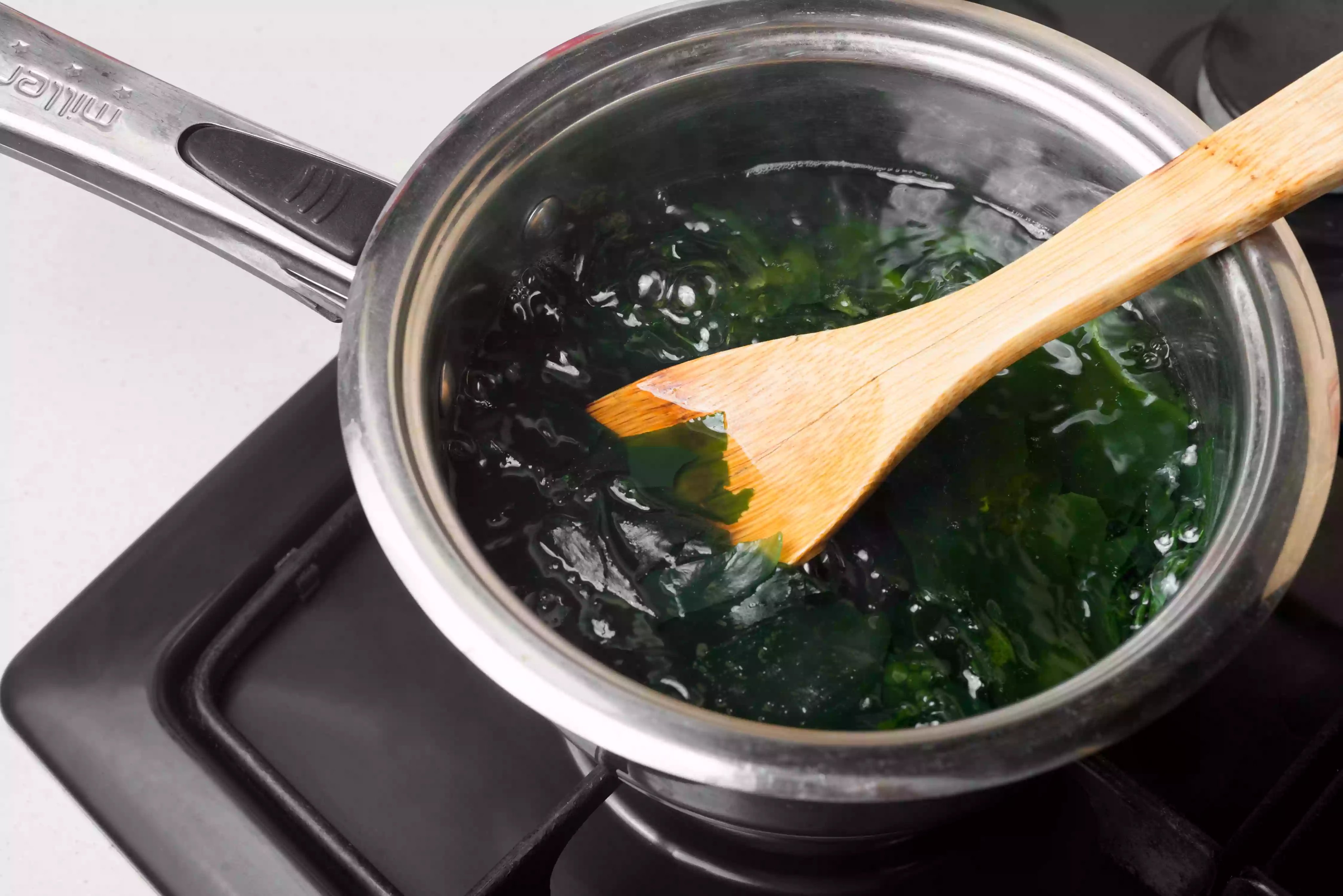 -Lúc chờ rong biển nở bạn tiến hành nấu nước dùng Dashi từ tảo bẹ Kombu và cá bào, có thể nấu lượng lớn rồi để dùng dần cũng khá tiện lợi (hoặc có thể dùng hạt nêm Dashi thay thể khi nấu).