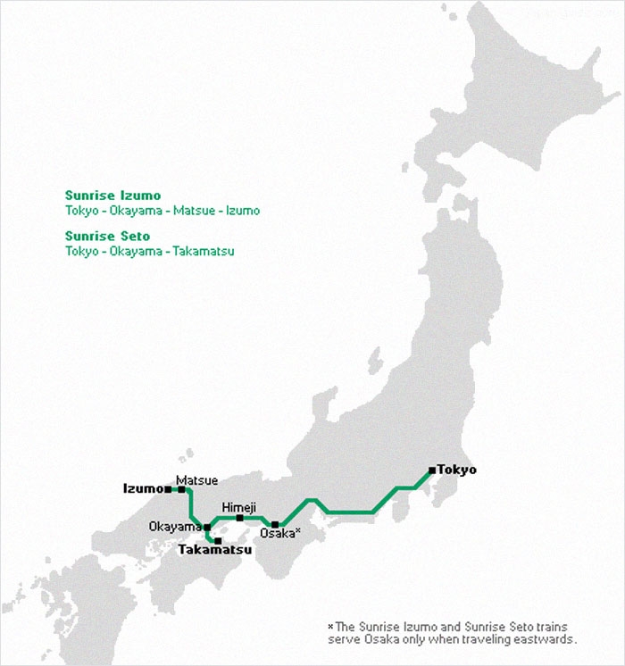 Tàu Sunrise Seto và Sunrise Izumo là những tuyến tàu đêm còn vận hành từ năm 1998 tới giờ. Trên hành trình rời Tokyo, hai tàu này ghép chung thành tàu 14 toa chạy tới Okayama mới tách riêng.