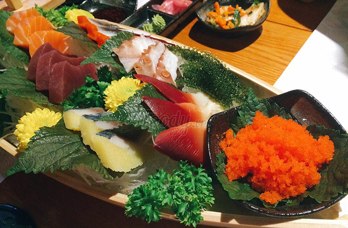 Thông thường trứng cá Ebiko Masago (trứng tôm) được dùng để làm sushi hoặc sashimi như thế này