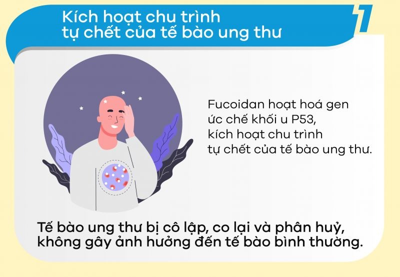 Tế bào ung thư với đặc điểm “bất tử”, không tự chết đi như tế bào thông thường mà còn có nguy cơ lây lan, phát triển mạnh mẽ hơn. Chính vì vậy, việc điều trị và tiêu diệt tế bào ung thư trở nên vô cùng khó khăn và tỷ lệ tái phát cao. Điều đáng mừng là các nhà khoa học đã phát hiện Fucoidan có khả năng “kích hoạt” tế bào khối u P53, bắt đầu chu trình tự chết của tế bào ung thư. Từ đó, tế bào ung thư bị co lại, phân hủy tự nhiên mà không gây ảnh hưởng đến các tế bào bình thường. Đây cũng là được xem liệu pháp bổ trợ cho người đang sử dụng sản phẩm hỗ trợ điều trị ung thư, phẫu thuật hoặc hóa trị liệu.