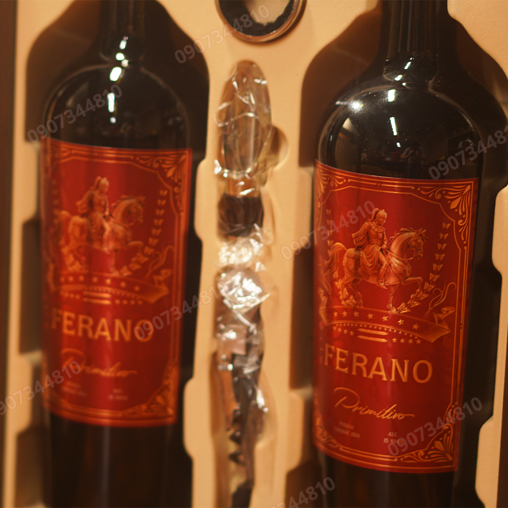 Hộp gỗ rượu vang đỏ Ferano Primitivo với 2 chai vang Ý sang trọng và lịch sự làm quà tặng cho màu tết và dịp đặc biệt.