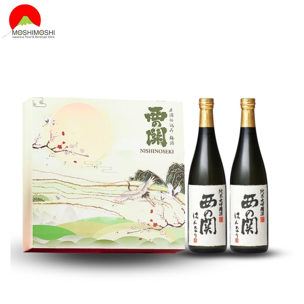 Bên trong hộp rượu là 2 chai rượu sake Nhật Nishino Seki Hannary thuộc dòng rượu Junmai-Daiginjo được làm từ gạo Yamada Nishiki với nồng độ cồn 16%. Nishino Seki Hannary có hương vị nhẹ nhàng như tuyết và thiết kế sang trọng cao cấp.