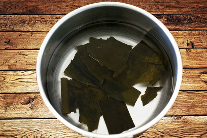 Bước 1: Ngâm tảo bẹ kombu trong 800ml nước. Thông thường khi nấu nước dùng dashi người Nhật sẽ ngâm tảo bẹ kombu qua một đêm, và hôm sau có thể sử dụng. Nếu chúng ta không có thời gian có thể ngâm tảo bẹ kombu từ 1 đến 3 giờ.