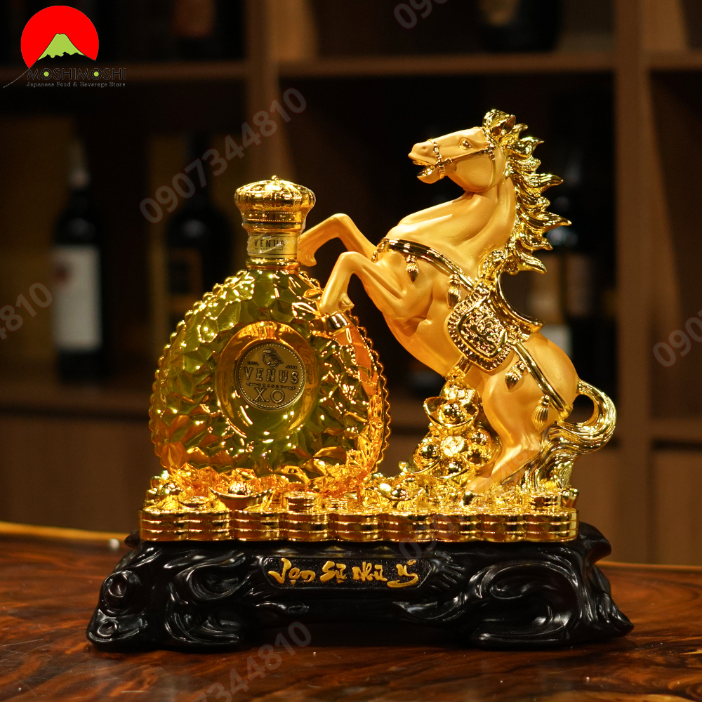 Đặt bên cạnh ngựa là chai rượu ngoại Brandy XO từ Pháp ủ từ những trái nhỏ ngon mang đến dòng rượu thượng hạng. Rượu được chứa trong chai thủy tinh bộc lộ được sắc hổ phách cuốn hút của rượu hoặc chai vàng lấp lánh.