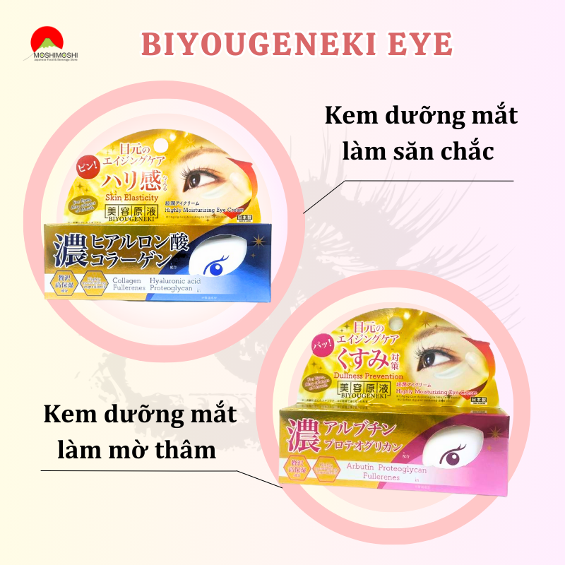 Khám phá bí quyết cho đôi mắt luôn rạng rỡ và tươi trẻ với kem dưỡng mắt Biyougeneki Eye. Đây là sản phẩm được thiết kế đặc biệt để làm mờ thâm quầng và săn chắc da vùng mắt. Với công thức giàu dưỡng chất, Biyougeneki Eye không chỉ cung cấp độ ẩm, tăng cường độ đàn hồi, làm sáng da mà còn chống lão hóa hiệu quả, mang lại vẻ tươi tắn và trẻ trung cho đôi mắt của bạn.