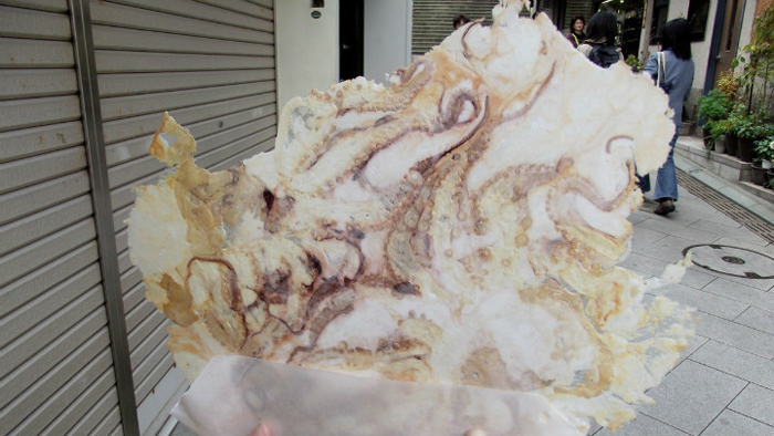 Món Tako senbei này là một loại bánh giòn với thịt bạch tuộc khô ép mỏng chiên cùng bột bánh gạo Nhật. Món ăn này khá lạ miệng và được đánh giá là ngon. Tuy nhiên, món bánh này chỉ được coi là độc đáo chứ không thể nói là đẹp khi nhìn chúng thật không bắt mắt chút nào.