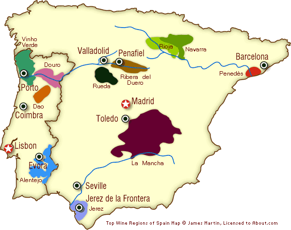 Các vùng sản xuất rượu vang của Tây Ban Nha cách biệt nhau khá xa và rượu của mỗi vùng làm cũng có những tính chất khác hẳn nhau. Hiện giờ có tới 72 vùng được công nhận là làm ra rượu có phẩm chất tốt và có cá tính rõ rệt.