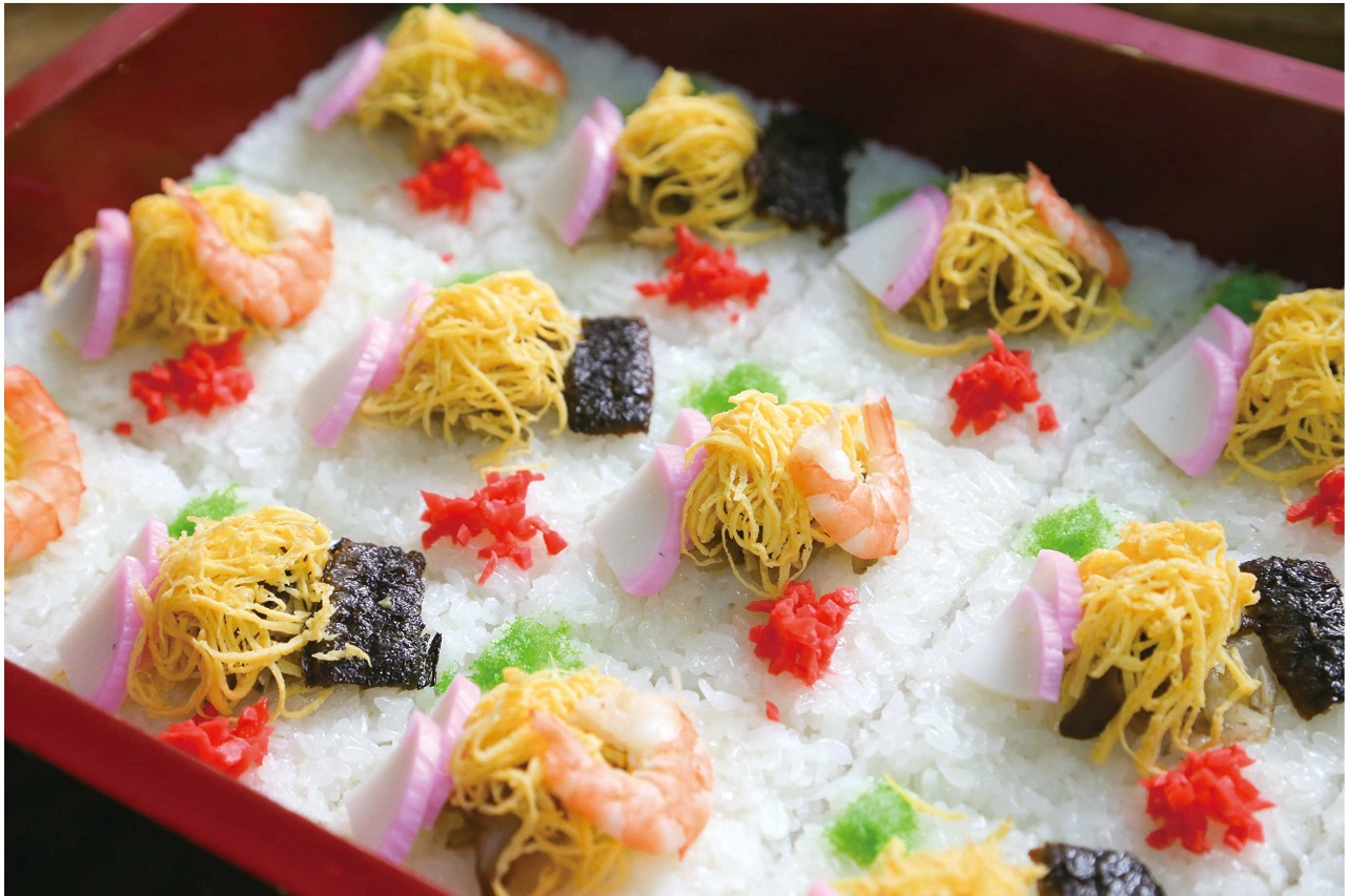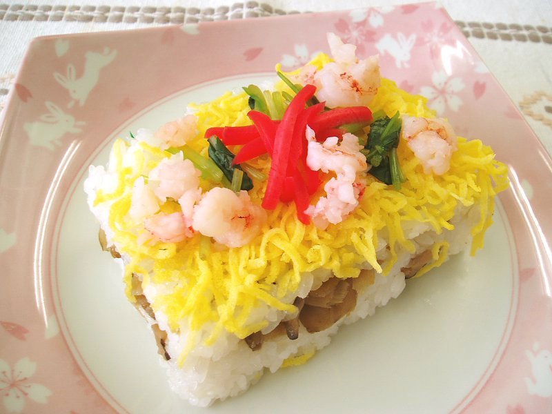 Mỗi ô vuông riêng lẻ tượng trưng cho những cánh đồng và bông lúa. Phía trên là trứng tráng được xem như mặt trăng tròn giúp mùa màng tươi tốt. Khi ăn sẽ được cắt thành miếng bằng thìa và thưởng thức cùng gừng hồng, cũng như nước tương.