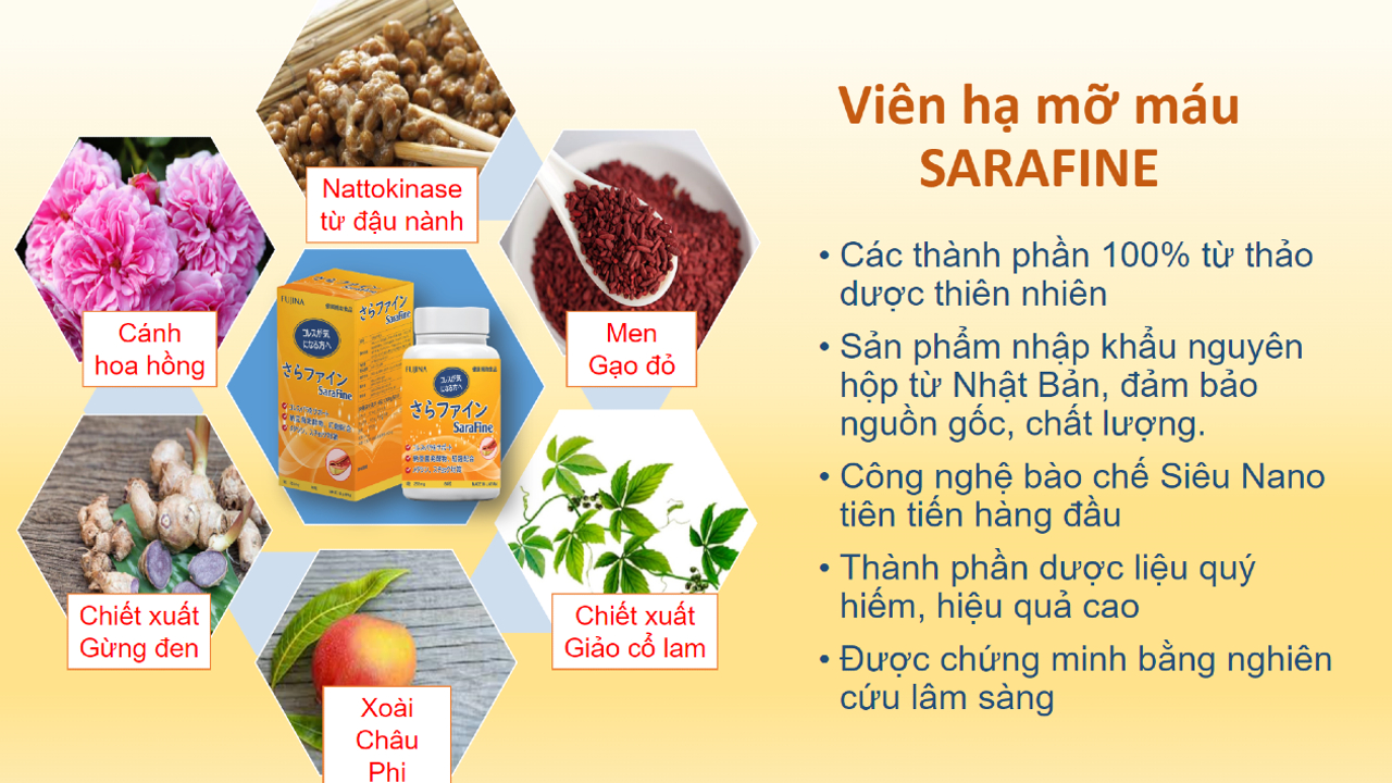 Viên hạ mỡ máu SaraFine Nhật Bản là sự kết hợp tinh túy giữa các thảo dược tự nhiên quý, được sử dụng lâu đời trong nền y học cổ truyền Nhật Bản với nhiều tác dụng dược lý nổi bật như: Men gạo đỏ, Nattokinase, xoài châu phi, cúc vu…
