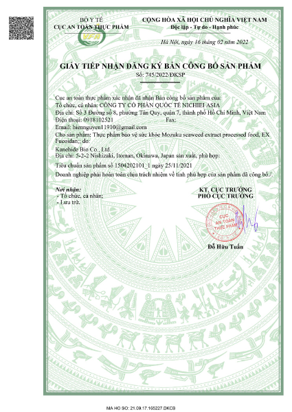 - Sản phẩm Viên uống tảo nâu EX Fucoidan đã được kiểm nghiệm và chứng nhận bởi các cơ quan y tế uy tín tại Nhật Bản và quốc tế. Tại Việt Nam, sản phẩm được Bộ Y Tế phê duyệt công bố sản phẩm và được phép lưu hành trên thị trường. Điều này khẳng định nguồn gốc rõ ràng, uy tín của Viên uống tảo nâu EX Fucoidan, đảm bảo sức khỏe người tiêu dùng.